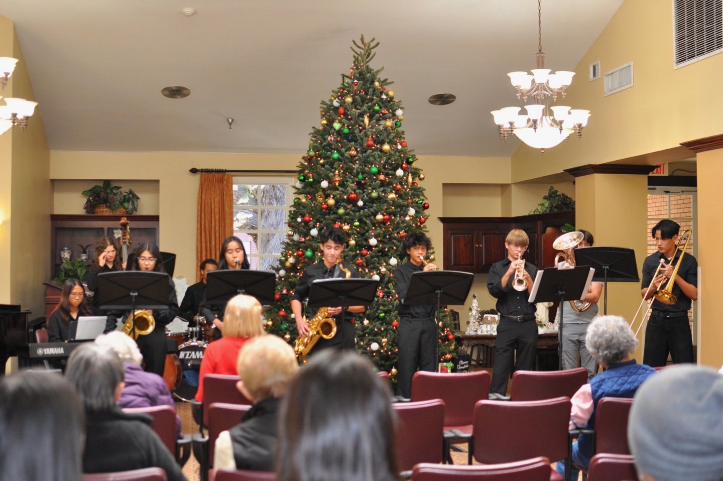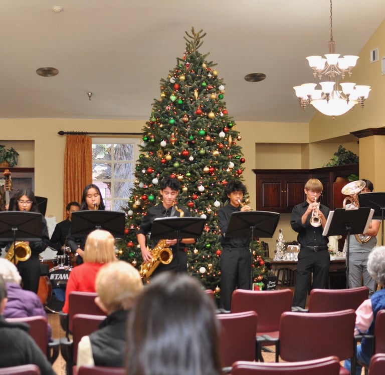 Our recent Magic of Music event was on December 15th, 2024, at Carmel Village in Fountain Valley. Talented musicians from Fountain Valley High School, along with a jazz band from Mission Viejo High School, delighted an appreciative audience of senior residents with their performances. It was truly heartwarming to see the smiles on the faces of the crowd and the excitement of the students as they shared their music.